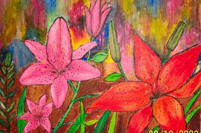 "Japanese Lilies" I painted these lilies right of my back porch. My husband planted them so I painted them for his birthday. I think it was an oil painting. The painting might be tucking away somewhere.