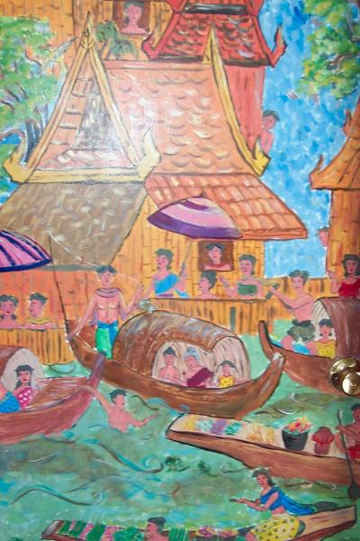 "Floating Market" I painted this picture with acrylic on my bathroom door. Notice a door nob on your right? We're debating whether to take the door with us when we move to a new place.