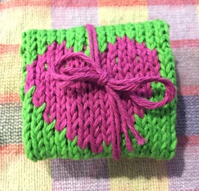 This dishcloth is an unexpected project that I just came up last minute. My anthropologist husband is on his way to a 2-weeks road trip to Idaho. He wants to do some more research on his ancestors who came to America during the pioneer time. There are so many fascinating history he've fond and this motivates him to turn this into a book! It's a long story but anyway he wanted to stop and pick up a photo book at my sister-in-law's place to take it on a trip. We haven't seen her and her husband for over a year. So I came up with this dishcloth idea the day before he left. I wanted something simple but with some meaningful thought to it. So, the heart was born! Nothing is more perfect than sending a heart to someone your love and care, right? It's a bit odd colors of green and purple but that what I have in my stash. I'm sorry I didn't measure the length before it left home but I would say it's around 8x8"