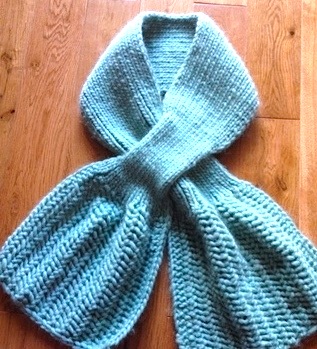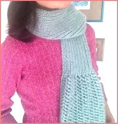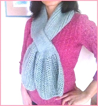 The scarf looks like a giant bow tie. Both ends have a simple lace design which looks almost like crochet. The scarf body part that wrap around the neck is worked in a simple 1x1 ribbing. I decided to add a keyhole because I want my scarf to stay better around my neck without slipping off all the time. Some people may not like keyhole and can just leave off this part.