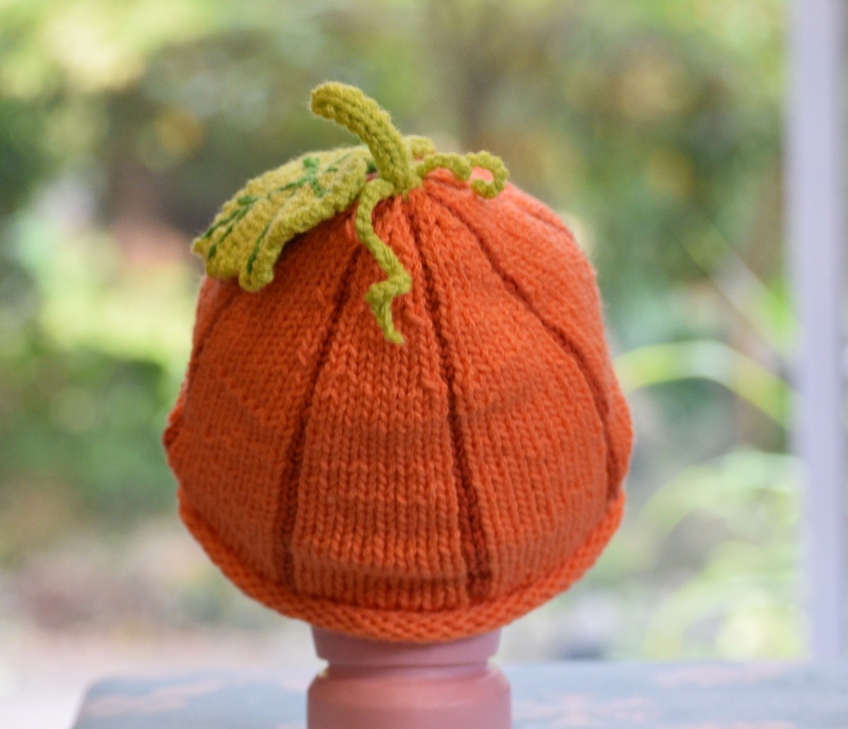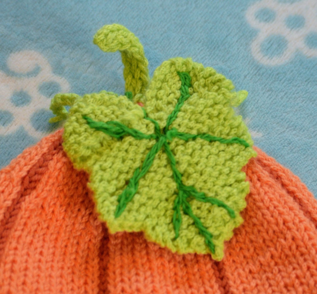 Use a dark green yarn to create small lines on the leaf. You can do slip stitches with a crochet hook or embroider it with the big eye needle. Try position the lines as shown in the picture below. Attach the leaf to the hat near the stem. If you want to make small spiral things (I just found out that they’re called “tendrils”) as well, then you can just do chain sts with a crochet hook. Make each one at about 3-4 inches long and then twist them it into spiral with your fingers. Then attach them at the base of the stem. I think that pretty much it. Hope you have fun making this pumpkin hat. Enjoy!
