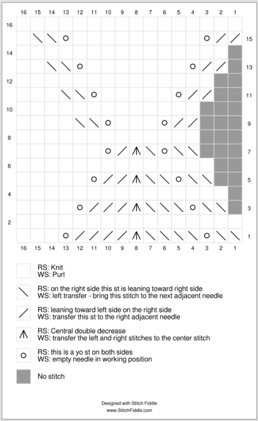 Follow the left Edging chart below and continue attaching the right-side stitches of the shawlette body every other row until the end of the shawlette body. Bind off all stitches when complete.