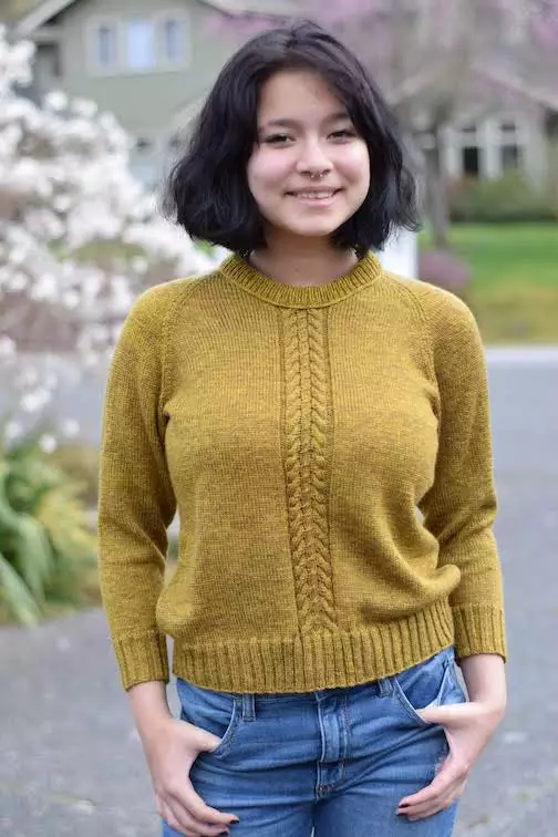This sweater is pretty much the same as Woman Pullover Raglan Sweater For Beginner - Free Knitting Pattern (see picture below) which I hand knitted several years ago. The only difference is that this Raglan sweater has a finer yarn and knitted with mid gauge knitting machine. Oh, and I added a cable panel to the center.