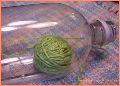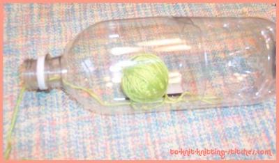 -Place a ball of yarn you want to knit with in side the top half of the bottle.