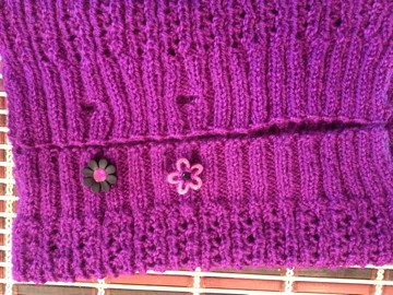 I added ribbing to another end and made a few button holes. My daughter picked her own unique buttons she bought during our trip to Vancouver. I think it turned out pretty well. She will need it when it gets colder during our walk to school.