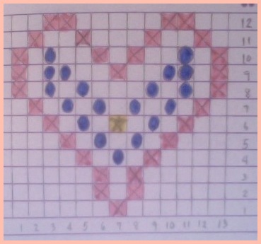 Once I had some idea of the shape and color I wanted for the bag, I drew a heart shape design on a piece of a paper (a graph paper would be better). You can download graph papers at www.theknittingsite.com for free.