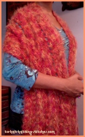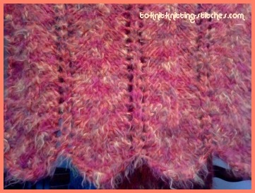 This soft and furry scarf is surely quite a comforter to wear around the house this Winter. It can be worn as a scarf, a shawl and a body wrap for a chilly day. The scarf body is knitted in chevron and feather stitches. It's easy enough for beginners and yet it look so elegance. I love the zigzag finished look on both edges of the scarf. This pattern could be great for making a table runner too, I think.