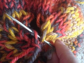 At this point the piece will become narrower and difficult to work in rounds. To save money from spending on an extra set of double pointed needles, I decided to work the rest of the pattern in rows as follow;