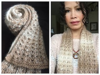 A scarf new knitter must try to master. You'll get a chance to practice a lot of "YO" and "k2tog". You'll be amazed how this 2 combo stitches will turn out.