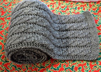 Handsome wool scarf in cross over stitch pattern. Knit without cable needle but gives you a nice cable effect. This scarf is fit for a prince.