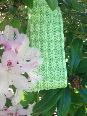 Above Pic: Green gardener headband/sweatband in brioche rib next to my blooming pink Rhododendron