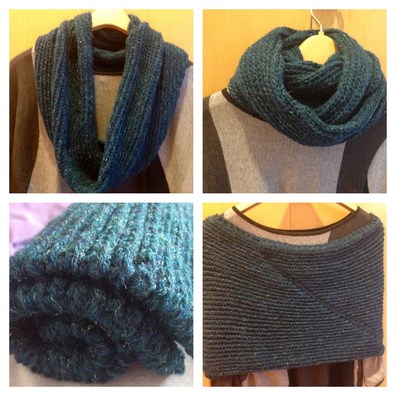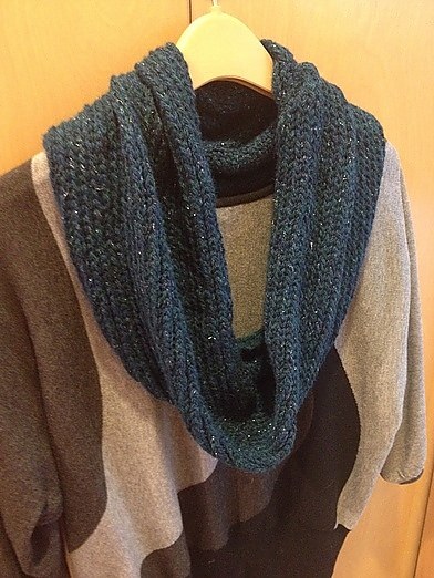 Description: A sleeky scarf that can be worn as a scarf, a wrap or a hood over head. This beautiful scarf is knitted using Turkish rib pattern and knitted in rows to form a long piece. Then both ends are joined together to form a ring. This would make a great Christmas and new year gifts since it doesn't take too long to knit. Choose any yarn you like. The possibility is endless.