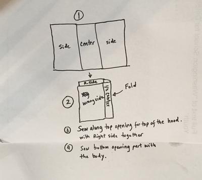Hi, I'm hoping you can help. I'm knitting a duffle coat for my grandson, and although I've been knitting for over forty years, I can not for the life of me, work out how to sew the hood together! It's made up of three pieces, two side panels and a centre back panel. It tells you to join the centre panel to the two sides, extending the centre panel along the top of the two sides.