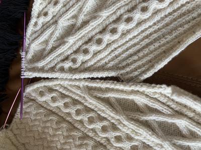 Back: After knitting 128 Sts in pattern for 16.5 inches(incl ribbing) I casted off 6 Sts at the beg of the next 2 rows then decreased 2 stitches every 2nd row until 62 Sts remained and then decreased 2 stitches every row until 40 Sts remained).