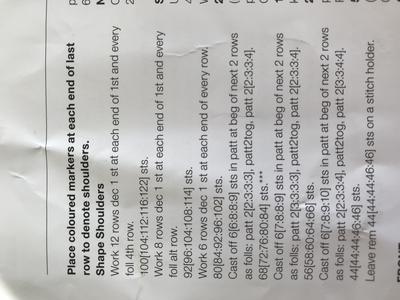 It says "Cast off 9 sts in pattern at beginning of next 2 rows as follows: pattern 3, pattern 2 together, pattern 4." Leaves 46 stitches remaining for stitch holder.