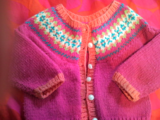 This baby sweater was quite fun to knit. It has rib pattern on body and sleeves and two front pockets. I used affordable and washable acrylic yarn because I never know what kids will do to the sweater. The girls outgrew the sweater so quick. They only wore this one for couple of times.