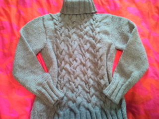 I got this knitting pattern from Vogue Knitting Magazine. It was very challenging knitting those ribbing. I knitted the back portion and sleeves on Ultimate Sweater Machine (USM). I couldn't wait to see how it turn out when I first knitted. This turtle-neck sweater made out of wool. I love the gray color!