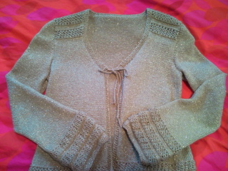 Fast and fun knitting project, this camisole is soft and comfy. Knitted with sparkling-golden-tubular yarn from Lion Brand.