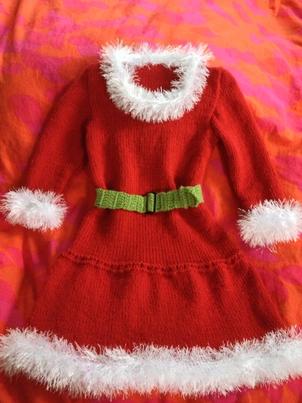 Description: Little miss Claus is a cute, close fit, below-knee dress with long sleeves for girls. It can be worn as a costume for a party, a halloween trick or treat and Christmas holiday. The neckline, hand cuffs and hemline are embellished with white fun fur. The dress is knitted in 4 pieces - front, back, and 2 sleeves.