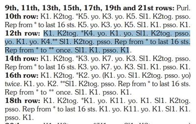 K1. K2tog. *K4. yo. K1. yo. Sl1. K2tog. psso. yo. K1. yo. K4.** Sl1. K2tog. psso. Rep from * to last 16 sts. Rep from * to ** once. Sl1. K1. psso. K1