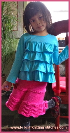 My younger twin daughter wanted to have a pink skirt when she saw me knit a purple skirt for my niece's daughter. So, I came up with this one using a scallop pattern for the 3rd tier. I really like the look of the edge. It reminds me of a crochet scallop edge. Enjoy! and don't forget to send me a photo of it when you're done.