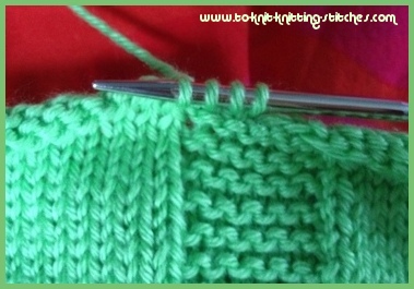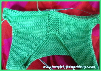 We will be working on the bottom half of the vest next. Turn piece upside down and with the front facing up, pick up the 3rd garter stitch at center front and knit (see images below).