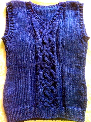 Description: School vest for girls chest size 21, 23 and 25 inches with hour glass body shape. The center of the front features Fancy cross and cable panel. To make this vest for boys, you can eliminate the body shaping. Just work straight up without decreasing or increasing the body shaping. The vest has a standard fit (not too loose and not to tight). The finished product will be slightly larger than its chest measurement.