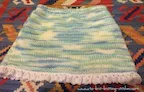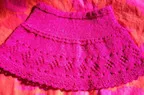 Image I: short skirt with lacy edge knitted with variegated worsted weight yarn decorated bottom edge with preexisting white nylon lace.