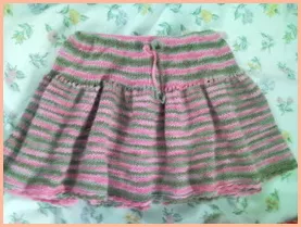 A short skirt for girl knitted in stockinette stitch on its main body. The waist of the skirt is in 1 x 1 ribbing pattern and the lower edge is in garter stitch. The lace is added to the lower edge to give it a more delicate look.