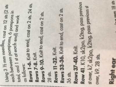 I am knitting a pom pom yarn teddy cushion & with 36 stitches on the needle I have to do this. K10, sk2po, k2tog, pass previous stitch over. K7, sk2po, k2tog, pass previous stitch over. K9. 28st.