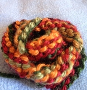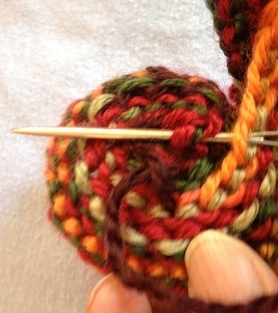 ![]() The trick is on row 5 where the twisting takes place. Follow the pattern above and use this photo as reference. Rotate left needle along with working piece downward and toward back until complete round. |