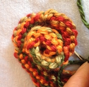 ![]() Shaping your work into a rose like so. I like to roll my rose with right side up. You're welcome to try the wrong side. You might like it better. |