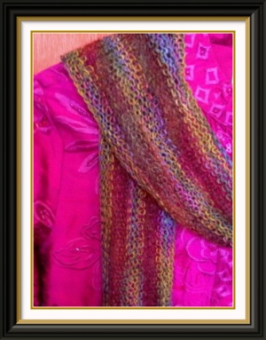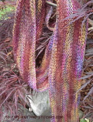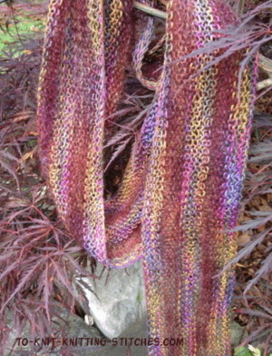 This scarf is as light as a feather and I hardly felt any weight when I put it on. I knitted it loosely on US # 9 (6mm) in stripe pattern using combination of beautiful hand-dyed bamboo/cotton yarn and kid mohair. It’s a great scarf for Summer but can also be worn all year round. It's can be dressy or just plain casual.
