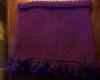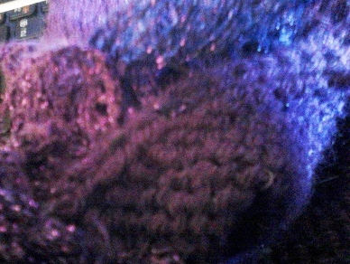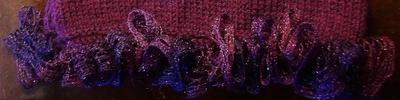 I made the skirt using Lion Brand Vanna's Choice acrylic yarn in Eggplant (color #145), especially poignant because they donate part of the proceeds to St. Jude Children's Research Hospital. Also, it was the only one our Michael's had that was the color I had in mind. For the ruffle, I went with another yarn, Red Heart Bouquet Sashay Metallic in Amethyst (Color #E782M-9949). It just so happened that our Michael's had it on sale in the color I wanted.