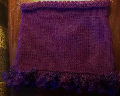 To bind off, I always knit using a crochet hook because I found it's easier to use the hook to pull one stitch over the other to bind off. So, instead of stitching on a lace at the edge of the skirt, as I bound off, I pulled up the ruffle yarn on the hook along with the skirt's yarn, so that the ruffle is knit into the bottom row of the skirt. I like that the lace edge can't be pulled off, and unless you look real hard underneath, you can't even tell how it's attached to the skirt. (I do want to point out that the edge that's normally considered the bottom when working with the Sashay, is the edge I put my needle into, so the ruffle fluffs more like lace).